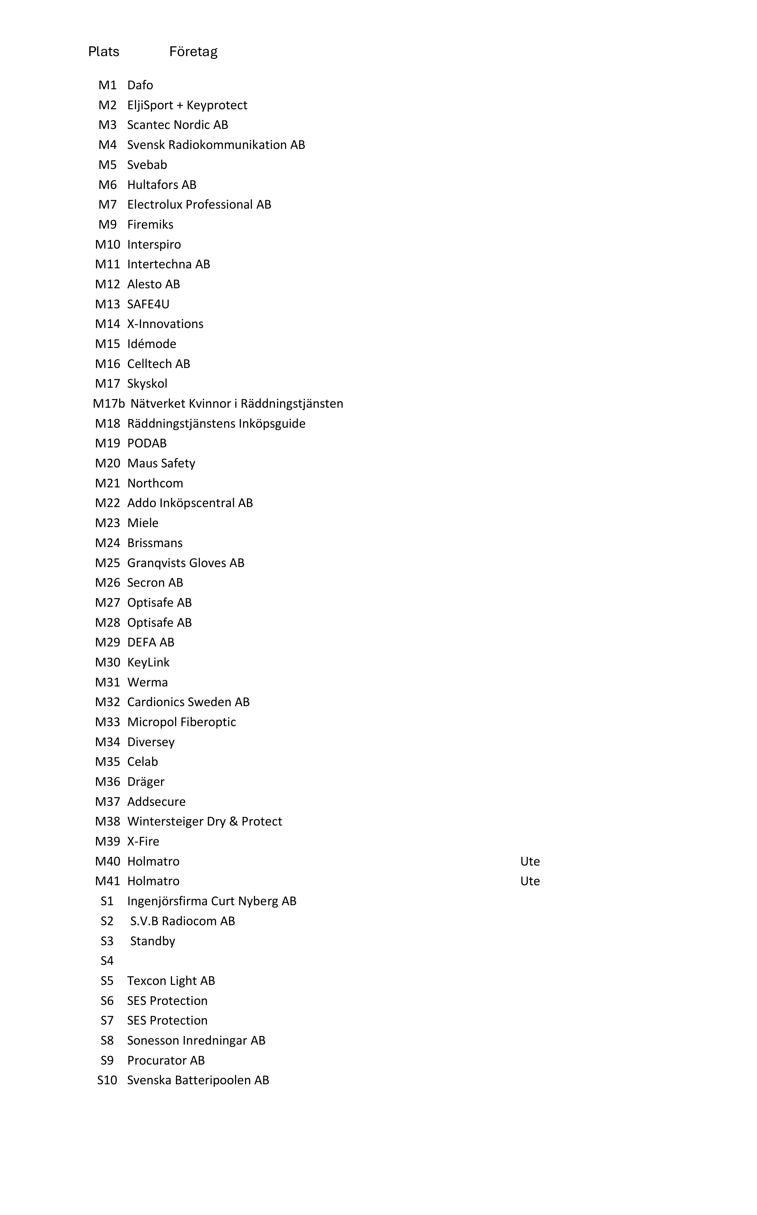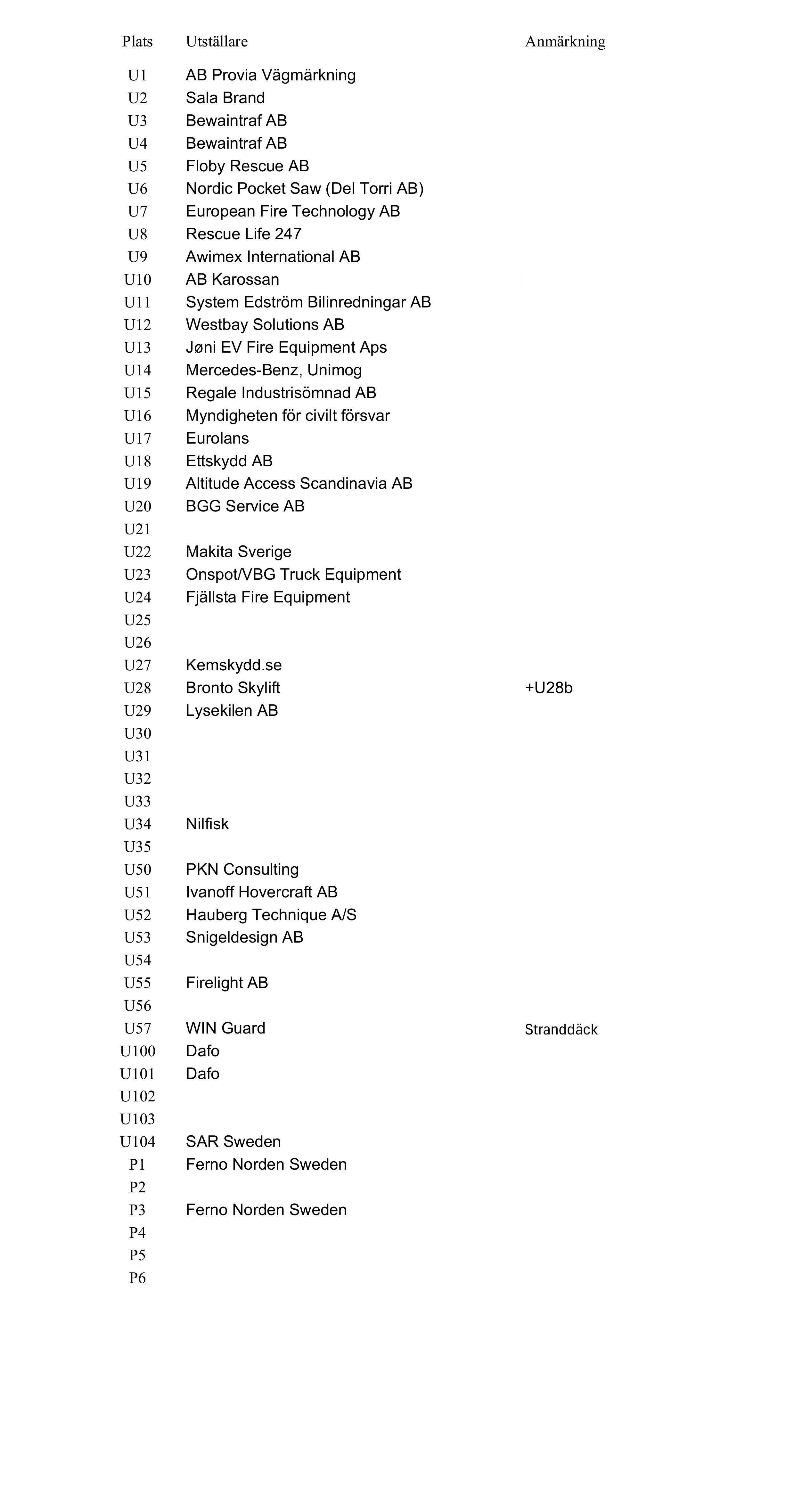 Bokade utställare utomhus Monter U, Paviljong P och Båtplatser B