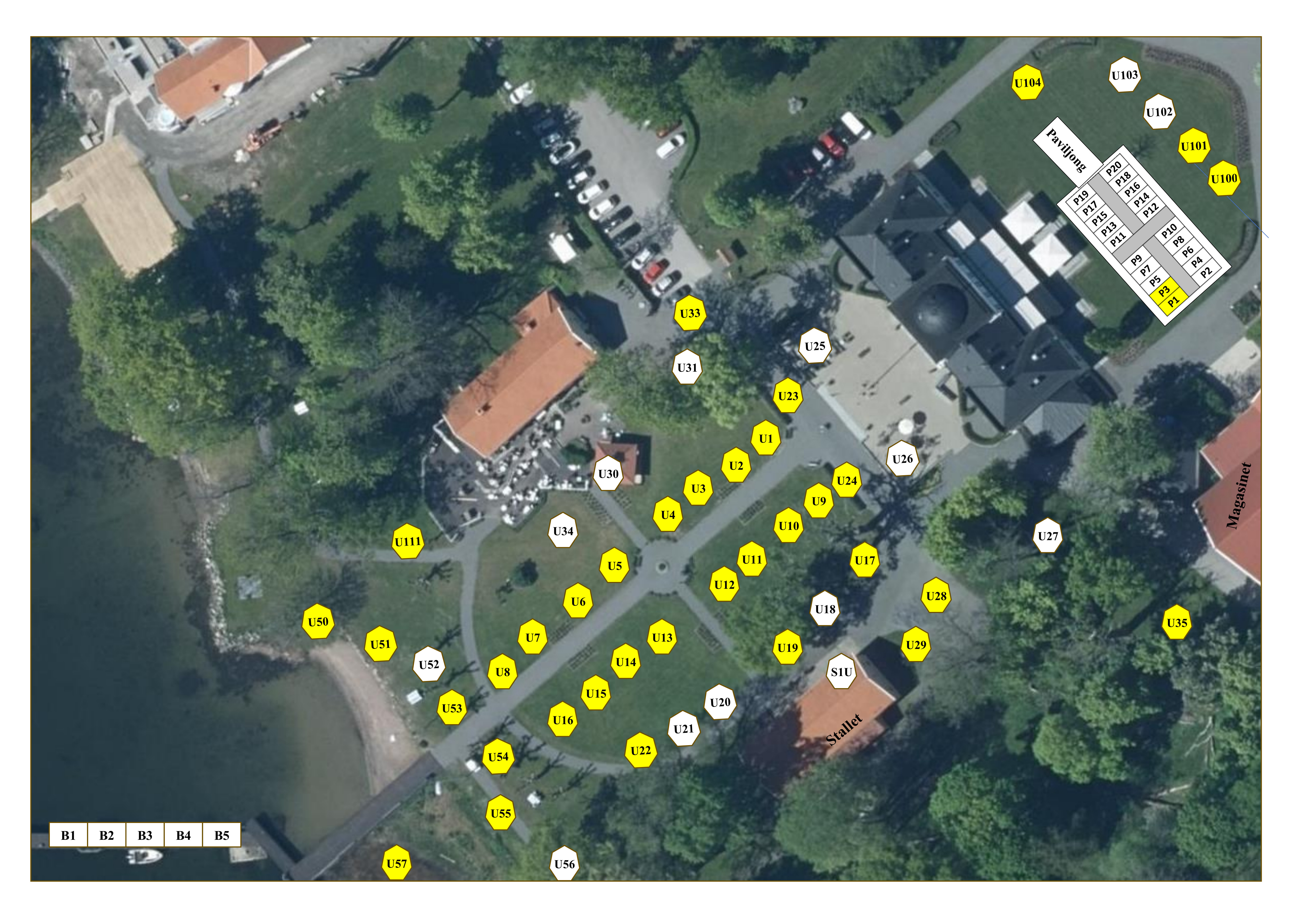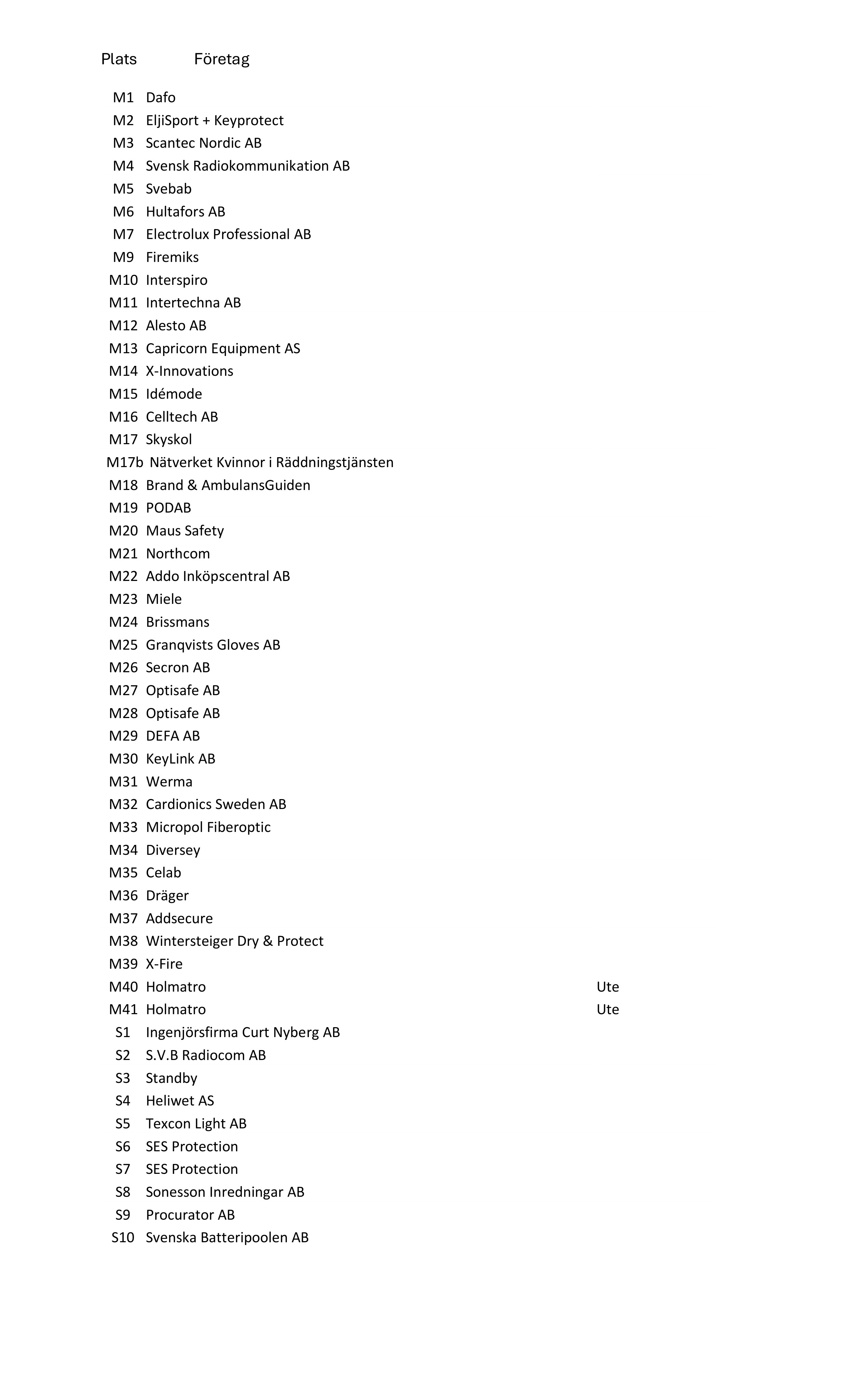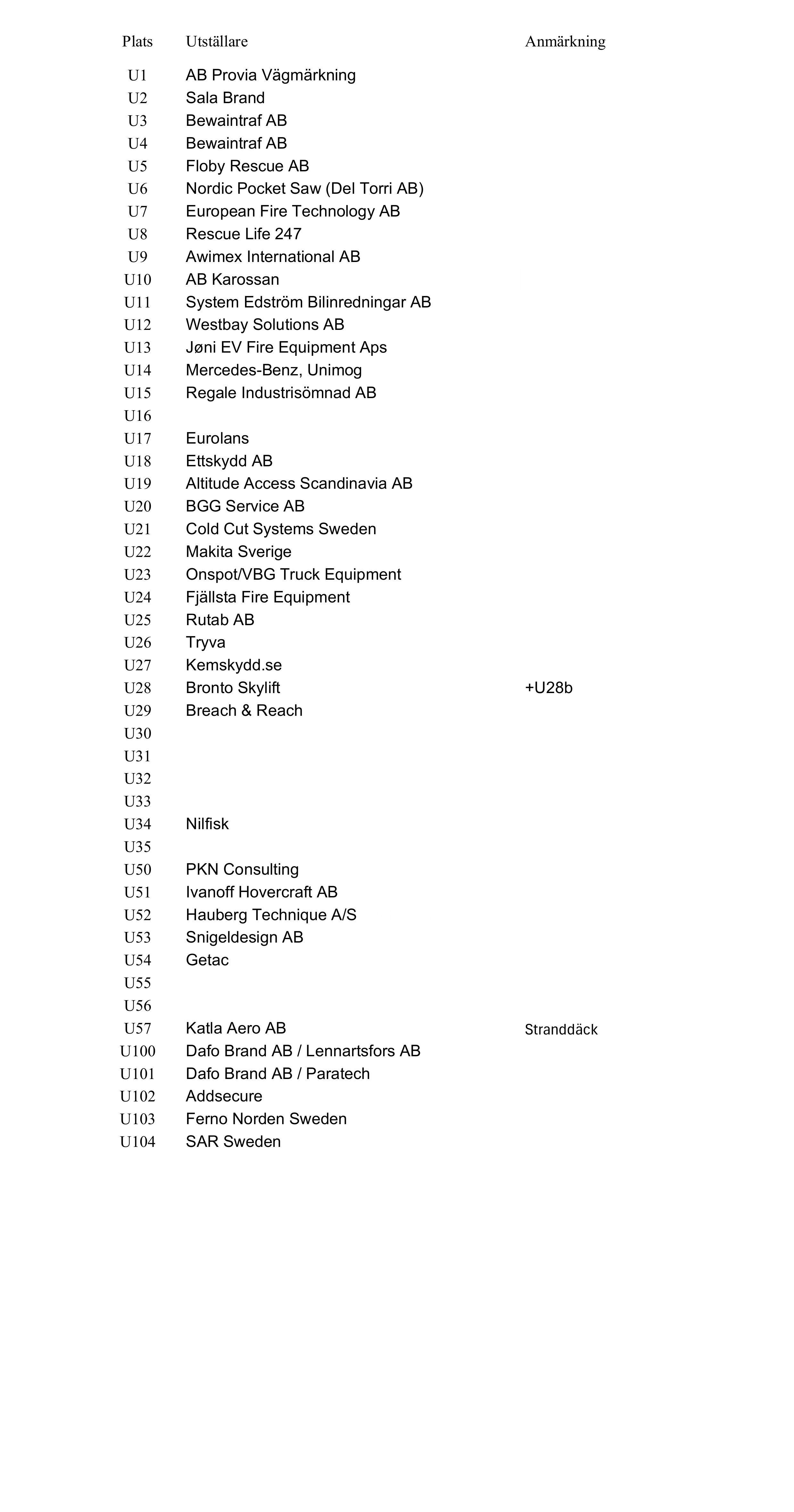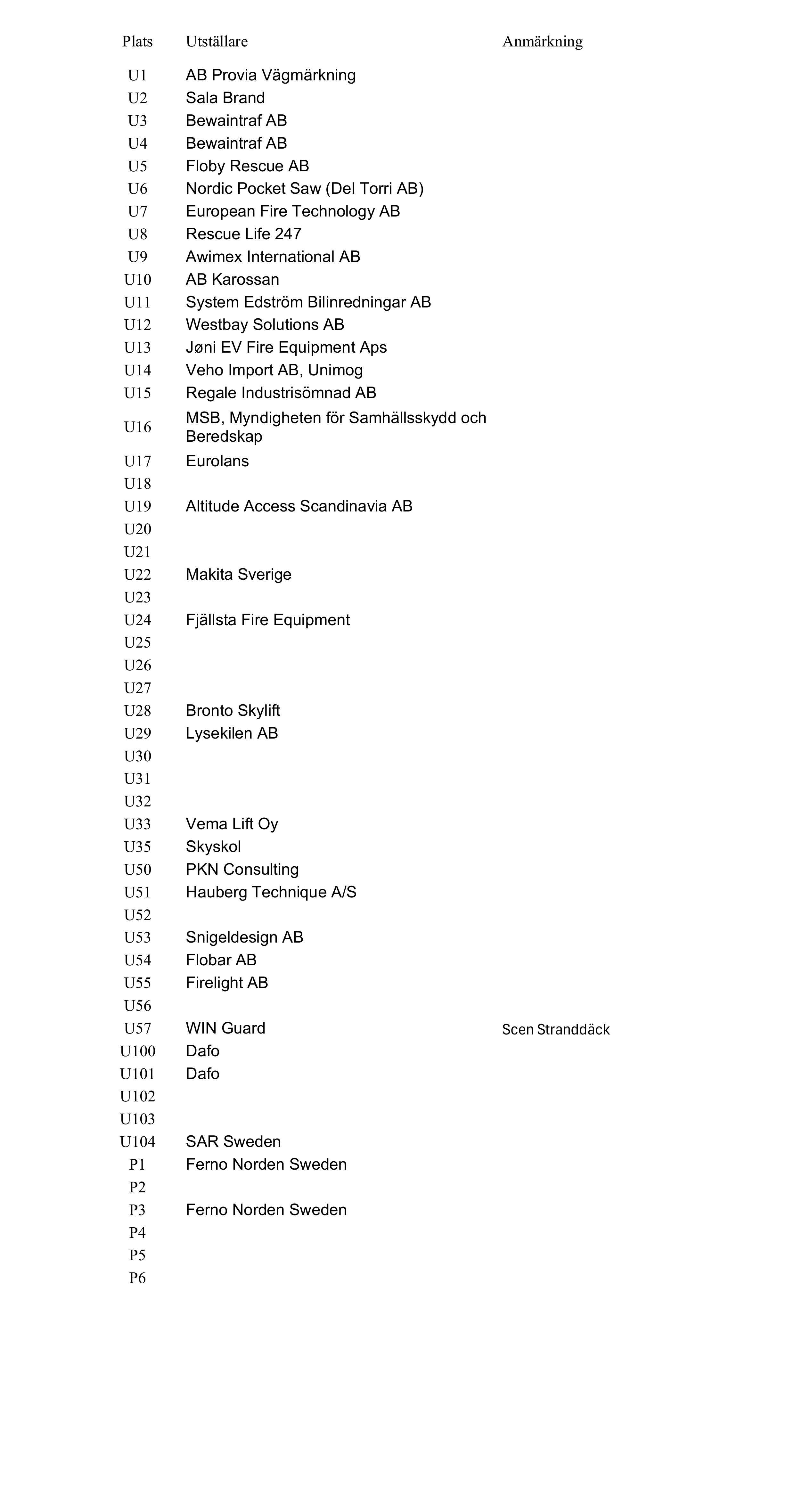 Bokade utställare utomhus Monter U, Paviljong P och Båtplatser B